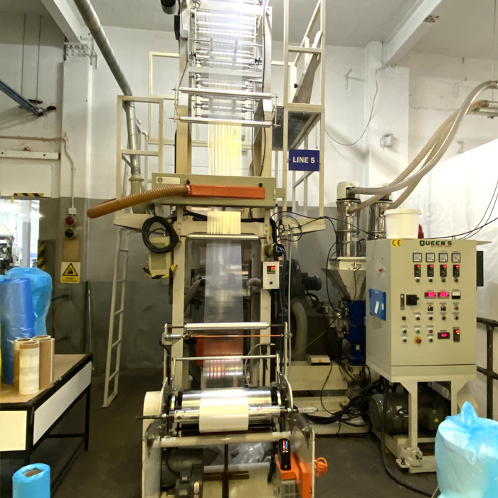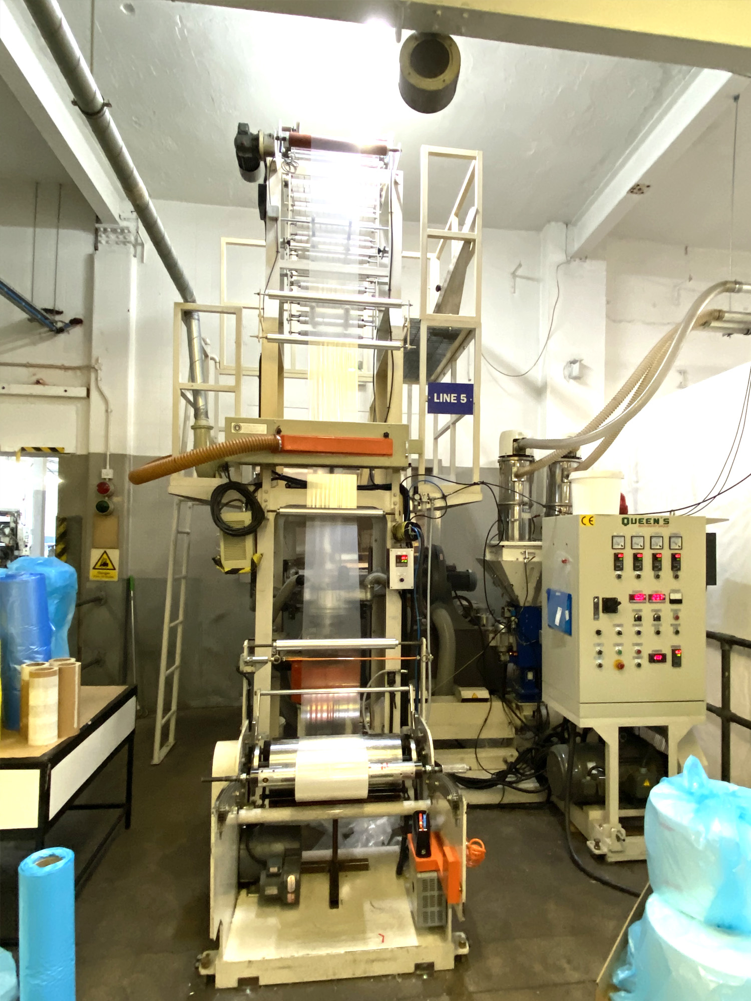 We have various blown film extruders that extrude film to make bags, which vary from very narrow widths up to much larger widths.